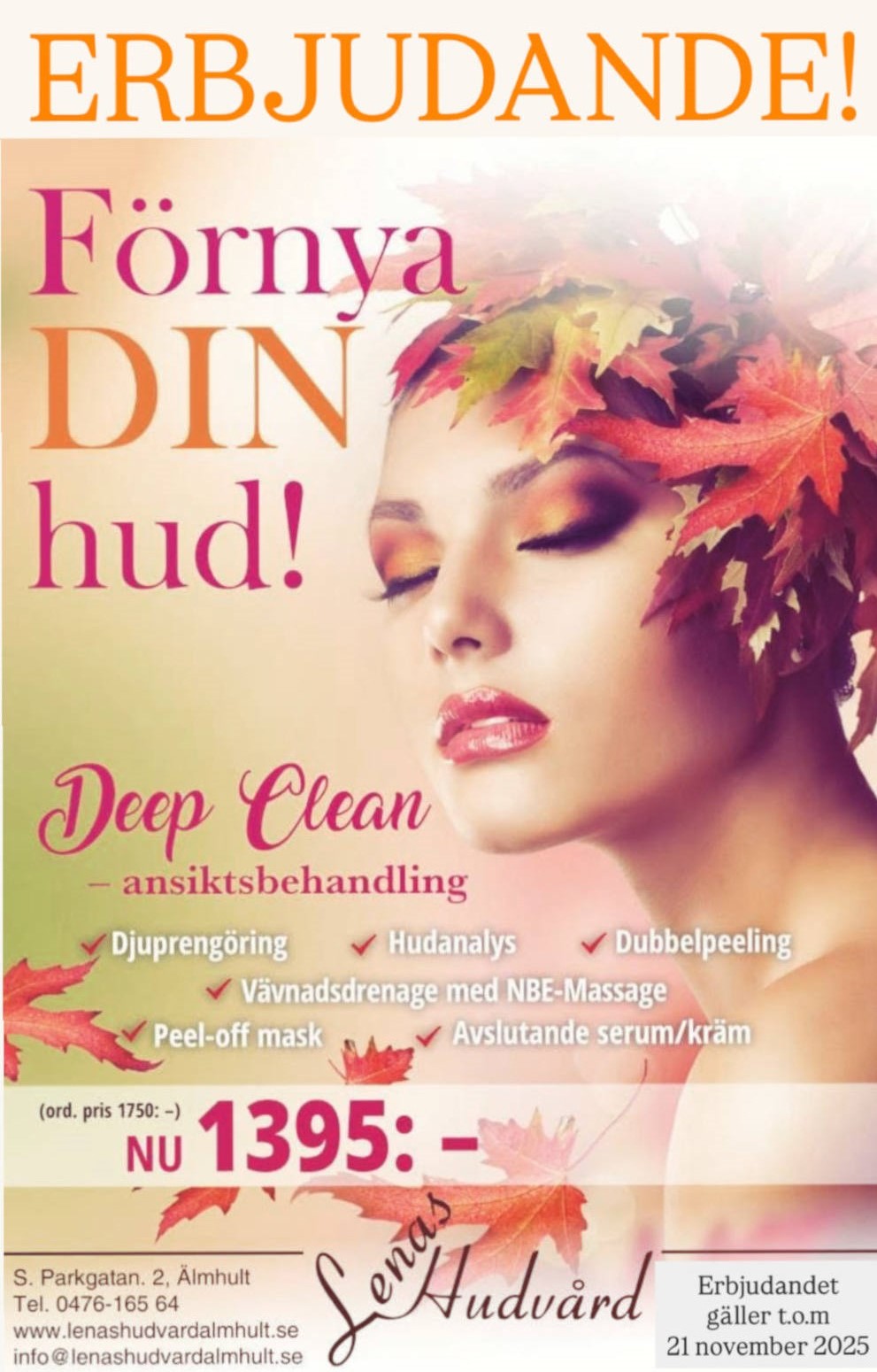 Vi erbjuder ansiktsbehandling, hårborttagning, nagelvård, hudföryngring, ansiktsbehandlingar, manikyr, pedikyr, brynfärgning, makeup, Enerpeel, kemisk peeling samt säljer hudvårdprodukter och makeupprodukter .