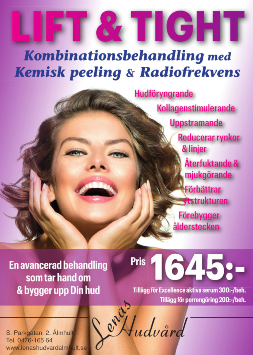 Vi erbjuder ansiktsbehandling, hårborttagning, nagelvård, hudföryngring, ansiktsbehandlingar, manikyr, pedikyr, brynfärgning, makeup, Enerpeel, kemisk peeling samt säljer hudvårdprodukter och makeupprodukter .